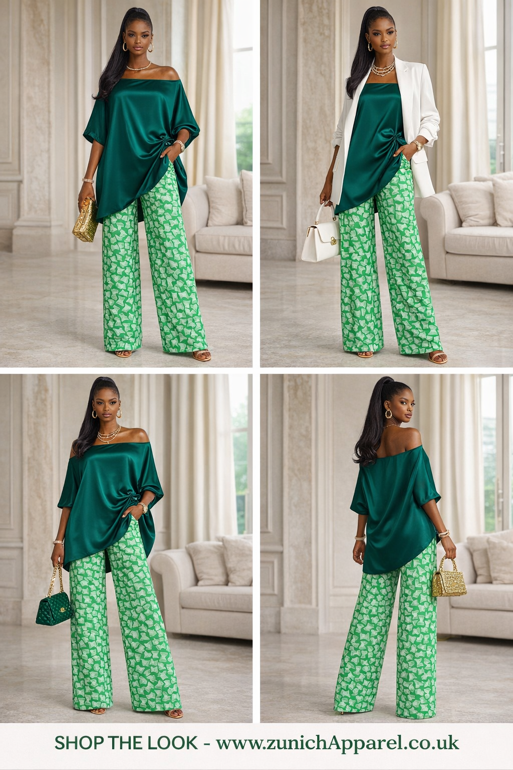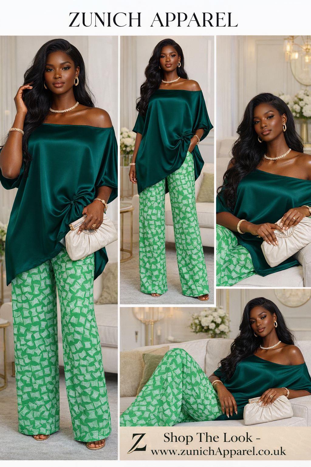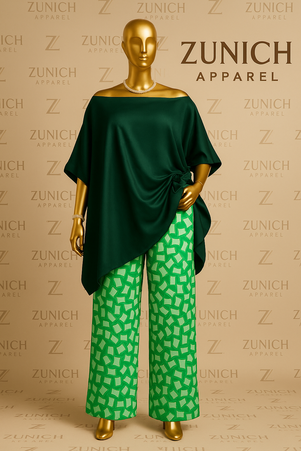 Step into effortless elegance with The Achalugo Emerald Ease Two-Piece Set. This stunning ensemble features a luxuriously soft, off-shoulder top designed with a relaxed silhouette and side-gathered detail that drapes beautifully over the body. Paired with wide-leg trousers adorned in a vibrant emerald geometric print, this set brings comfort and sophistication together in perfect harmony.