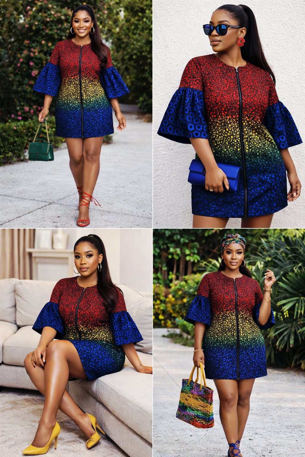 Make a statement in vibrant elegance. The Zuri Gradient Ankara Bell-Sleeve Dress features a captivating blend of rich colors transitioning seamlessly from warm tones to deep, bold hues. Crafted from high-quality African wax print fabric, this mini dress highlights your silhouette with a flattering, modern cut, while the dramatic bell sleeves add effortless flair.